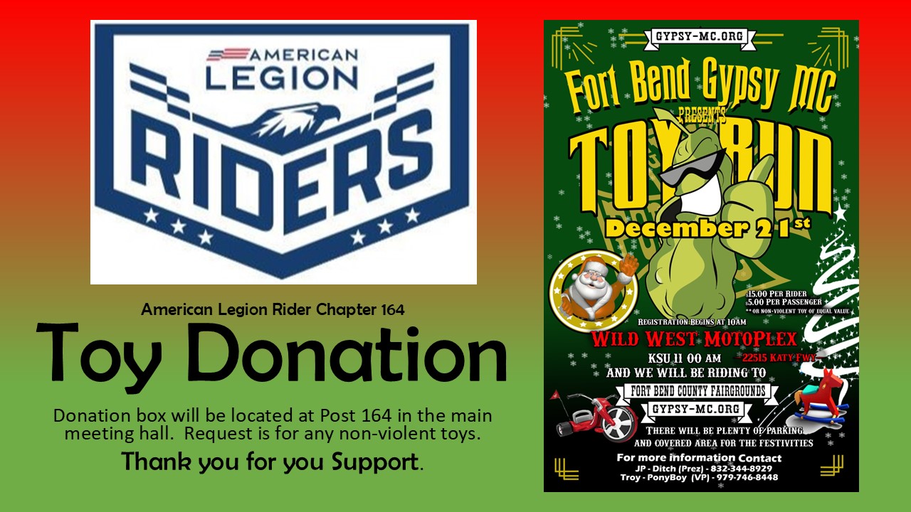 Come and check us out at 22125 Kingsland Blvd. Katy 77450. We have a Post membership meeting on the 3rd Tuesday of every month at 6:30 PM; an Auxiliary membership meeting on the 3rd Wednesday of every month at 7:00 PM; an SAL meeting on the 1st Thursday of every month at 7:00 PM; and a Riders membership meeting on the 4th Friday of every month at 7:00 PM.